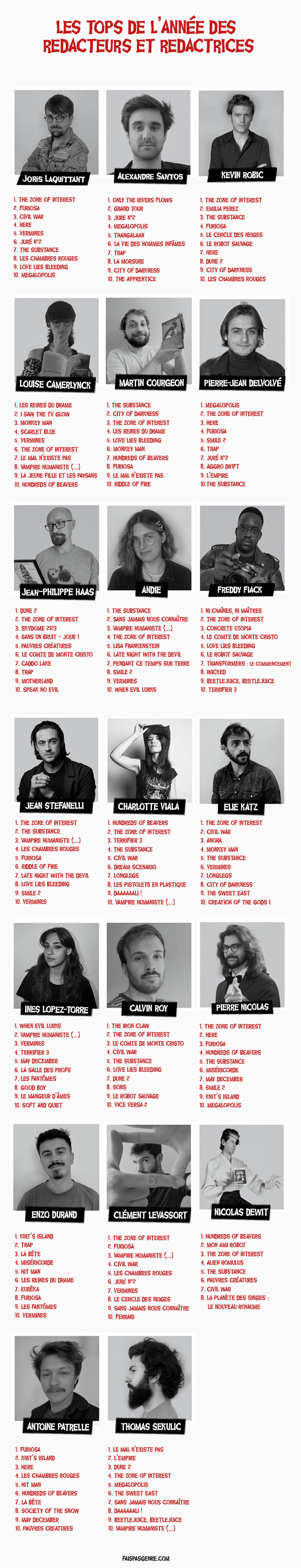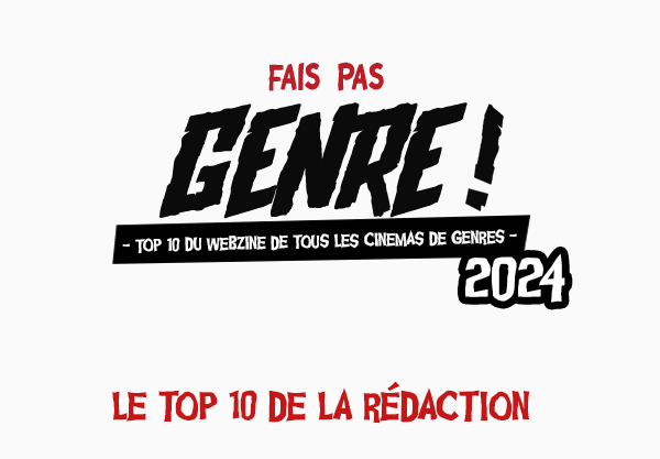 Une nouvelle année qui commence c’est surtout l’occasion de regarder en arrière pour livrer les habituels TOP10 et désigner le film qui « fait pas genre » de l’année. Chacun.e des 20 rédacteurs.trices a dû choisir les 10 films qui, pour lui/elle, « n’ont pas fait genre » en 2024 parmi ceux qui répondent aux critères de notre ligne éditoriale, et seulement ceux-là. Ne sont pris en compte que les films sortis en France (salles, vod, svod, dtv) entre le 24 Décembre 2023 et le 24 Décembre 2024.