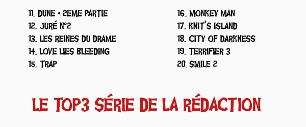 Après The Fabelmans l’an dernier c’est une nouvelle fois un film sorti en janvier, The Zone of Interest de Jonathan Glazer, qui est nommé film qui fait pas genre de l’année. Pourtant, ce long-métrage vu à Cannes et sorti en tout début d’année a été un oublié régulier des tops pour les différents médias cinéma, victime du temps qui passe. En ces lieux, The Zone of Interest a littéralement hanté l’année cinéma, sa puissance, sa rigueur, sa maestria n’ayant jamais été ébranlée par ces successeurs. C’est la première fois qu’un film de Jonathan Glazer remporte ce titre bien que nous avions offert une place de choix à Under the Skin dans le TOP10 de la Décennie 2010. Notre classement a aussi d’intéressant qu’il semble mettre en lumière le croisement intergénérationnel que le cinéma dit « de genres » connaît depuis quelques années et qui se cristallise tout particulièrement en cette année 2024. S’y mélangent ainsi de vieux loups comme Robert Zemeckis, George Miller ou Francis Ford Coppola et une nouvelle garde, notamment francophone, qu’il s’agisse de Coralie Fargeat et Sebastien Vanicek, ou de leurs compatriotes québécois Ariane Louis-Seize et Pascal Plante. La présence en grâce du cinéma de genre québécois est d’ailleurs à souligner, tant cette cinématographie, rare mais néanmoins dense, s’affirme comme l’une des plus vivifiantes à suivre pour ce qui est des cinémas qui nous intéresse ici. Cette année nous avons souhaité partager à nouveau le classement des places 11 à 20, pour deux raisons, d’abord parce que ces neufs films auraient, à peu de chose près, pu se retrouver dans le TOP 10 tant ils ont obtenu un score très proche du dixième, mais aussi parce qu’il nous semble que cela illustre encore davantage la pluralité de l’équipe et des sensibilités qui la compose. Côté série, après Scott Pilgrim prend son envol l’an dernier c’est la mini-série Mon Petit Renne qui a eu les honneurs de la rédaction, talonnée par la première saison exceptionnelle de The Curse. En queue de peloton de ce trio, c’est la série Fargo, qui roule sa bosse avec une saison 5, à nouveau plébiscitée.